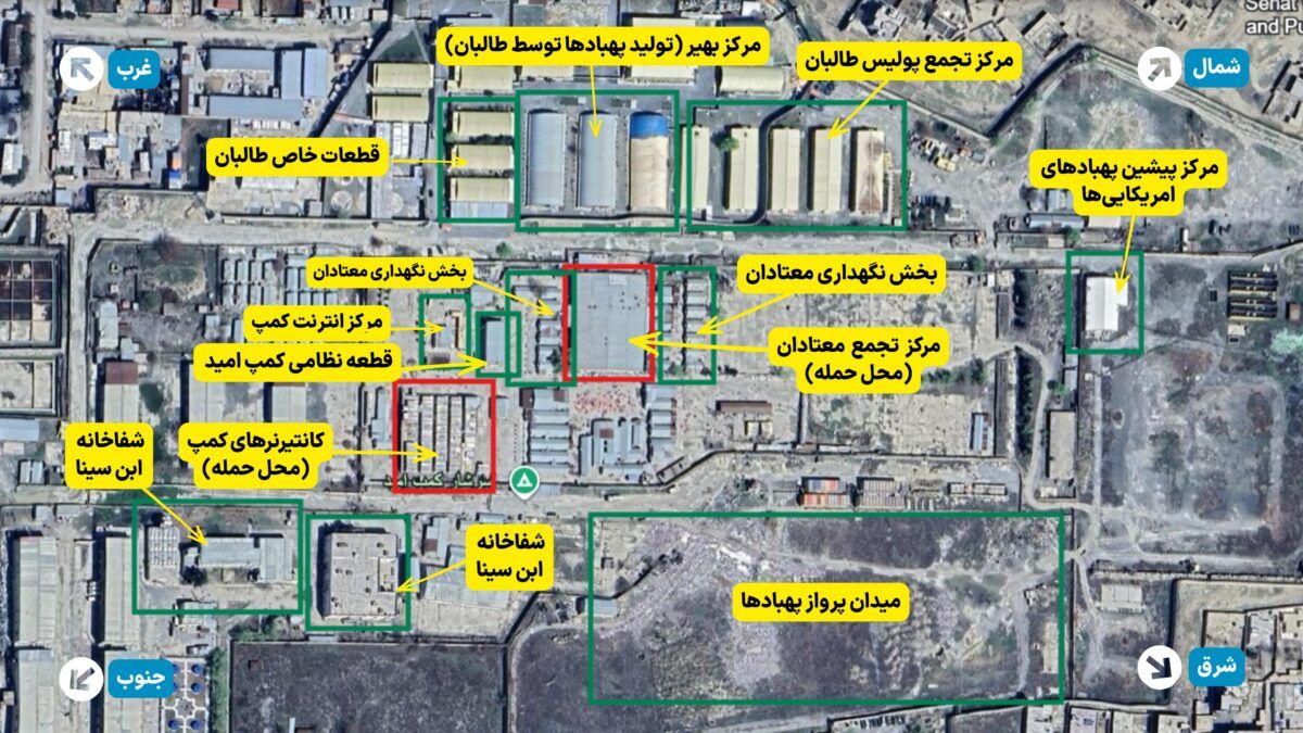Hope Camp, built during the former Afghan Republic era under the Ministry of Labor and Social Affairs for vocational training of recovering addicts, is now administered by the Taliban's Vice Ministry of Counter-Narcotics. Witnesses said the facility is located alongside three Taliban military centers, including the Bahir Center, which produces Taliban unmanned aerial vehicles.